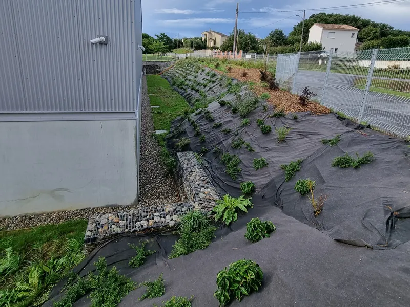 • Paillage des zones de talus, engazonnement de l’aire de convivialité pour le personnel