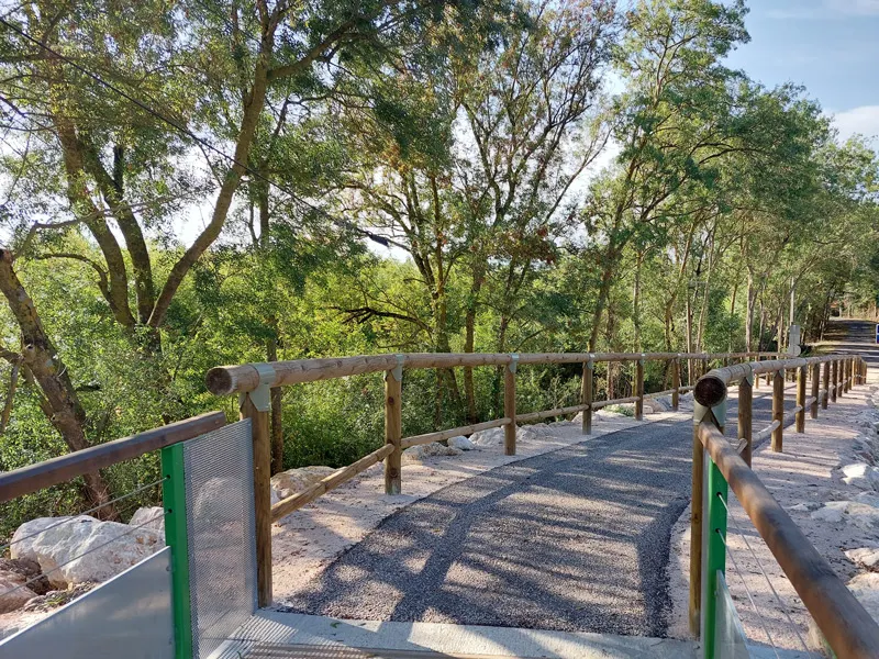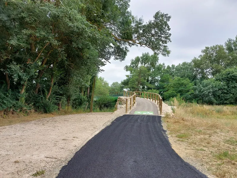 Aménagement des rampes de la passerelle sur la Louge (enrochements, voie verte en enrobé grenaillé calcaire)